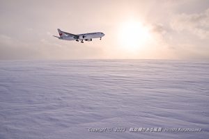 極寒の雪原でオリオンを見た まだ機影が見えない真っ暗な中でカメラを設定する ランディングライトが雪原を照らしはじめるとワクワクしはじめる 真っ黒だった雪原が真っ白に浮かび上がるのだ