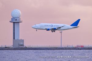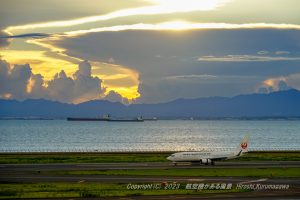 夏らしい夕景のセントレア 南国の水平線を思い出すような雲 そこへ降りてきたのはJTAの機体 なかなかナイスな組み合わせだ