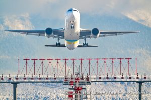 B767のパワフルな離陸 滑走路の先ではかなり高度が高く機体は小さく見えるほど しかし、影は等身大で這って来る 太陽が低いので影は長くなって這って来る