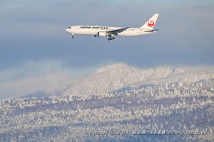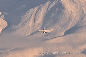 旭川の主役と呼んでいるJAL555 この日は妙なアプローチ、更にビジュアルアプローチに変更 低高度で山々を舐めながらRWY16へ進入 バンクをかけた機体にいい光が射し込んだ