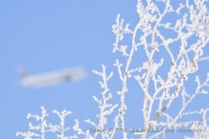 マイナス22℃まで下がった朝 幸運にも無風 霧氷が昼前まで残り、RWYは34 手持ちの800mmで霧氷に絡めてみた ISO3200 f32