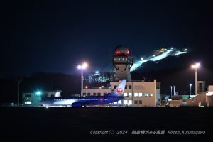 旭川空港の最終便、JAL558 管制塔に気象レーダーを被せてみる 科学特捜隊基地のような趣になった 背景のナイタースキー場も一役買っている