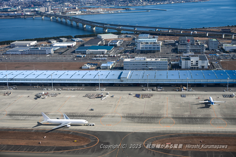 上空からセントレアらしく 2025.01.11 a.中部空港 貨物エリアと無地のB767 なんともフラットな光景が待っていた セントレアらしさを瞬時に見極める 橋を取り込むためにズームを引いた Nikon Z6Ⅲ NIKKOR Z 24-200mm f/4-6.3 VR