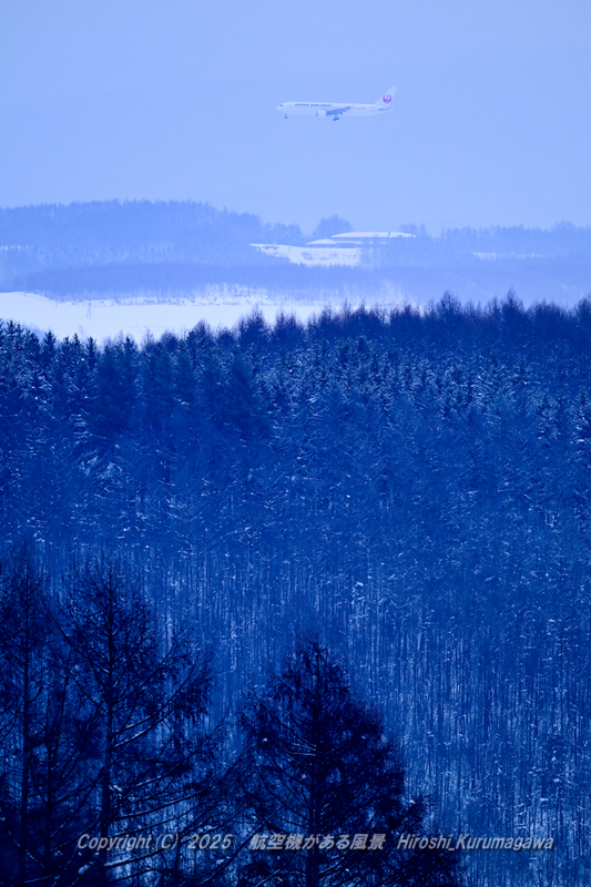 冬眠JL555 2025.01.20 8.旭川空港 勝手に主役と呼んでいるJL555 時に劇的な情景に飛び込んでくる便だ しかし吹雪の毎日はまるでゲキテキの貯金状態 単焦点レンズを立てて木立のラインを取り込んでみた Nikon Z8 NIKKOR Z 600mm f/6.3 VR S