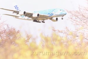 残念な成田での翌日 桜を見送るにふさわしい天気だった 昼休みに見上げた桜の合間を行く機 川崎市上空を行くのは福岡便だった