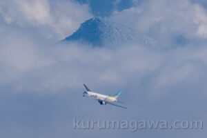 狙って待ち続けたというよりも、状況を読み続けた結果、ふいに訪れた一瞬を掬い取った一枚である。午後に入ると刻々と雲が広がり、山はほぼ完全に隠れてしまった。正直なところ、この時点では「今日は山バックは厳しい」と感じていたが、それでも旋回する機体を追いながら、雲の動きだけは視界の端で追い続けていた。