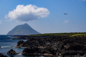 東の風、RWY08運用でビジターにはかなり残念な条件だ 向かいにあるゲームに出てきそうな小島、その名も八丈小島 その上をいい雲が流れていくではないか これはイケると思って待ってみたものの、想像以上に機体が小さかった