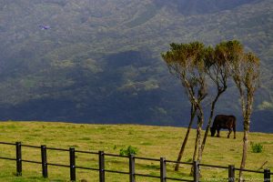 かつては北海道に次ぐ酪農の島だと説明を受けた なので貴重な1便をぼかしてまで絡めた牛 頭を上げてほしかったな、牛よ いい音を立てながら牧草を食っていた