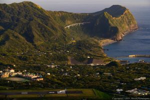 RWY08/26の八丈島空港 八丈富士の中腹にあるここ「ふれあい牧場」からはランウェイが見下ろせる なかなかいい光が注いでいるが、風向きが思わしくない 本当はあの橋の辺りを離陸してほしかった