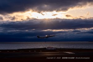 暗雲のお陰で太陽光がゴールドに見える ここに飛び込んでほしかったのは熊本行きのNH335 結構な向かい風だったのに意外に遅かったエアボーン 主翼に照り返しがあってこれはこれでいい