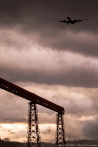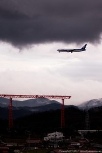 広島空港といえばやはりこの進入灯 順光で仰いでも美しいが、逆光でシルエットにしても美しい しかしまだ高度が残っているため、これに絡めるのは意外に難しい 表情のある空を背景にするには消去法でこの構図に落ち着いた