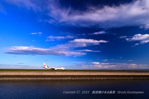 目の前をタキシングするB737 超広角レンズで運河と空の青を拾った 大分空港を思い出したがここは宇部 季節を変えて訪れて多くの発見があったUBE