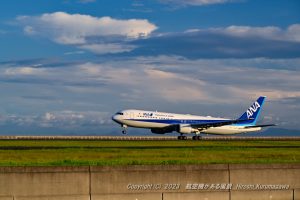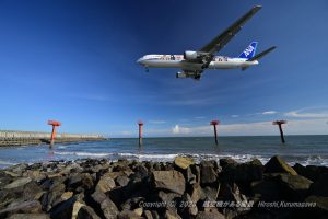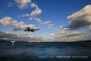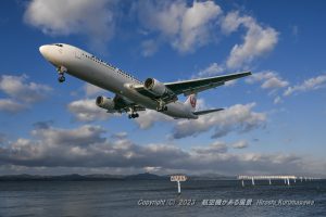 日に三本飛んでくるB767 次に来るのは機体に漫画が描いてある柄物 逆光でシルエットにしたかったがそこは海 なるべく下から狙おうとしたものの、クッキリと見えている