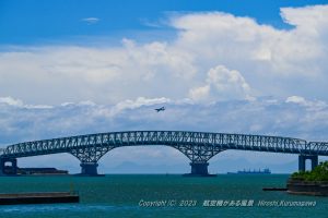 B767と興産大橋のコラボ しかし無線から聞こえてきたのは「Cancel IFR」 ここまで回り込んでくれることを祈って息をのんだ バンクしている姿に加えてダブルストレーラーも写し込めた