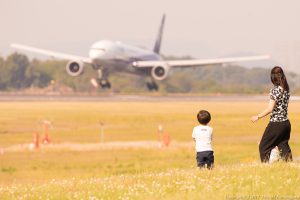公園で遊んでいた親子 那覇からのトリプルセブンが大きくバンクを描いて降りてきたのを見つけた 足を止めて見つめだした少年 この時の記憶が彼の一生を左右するかもしれない