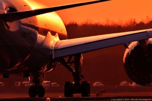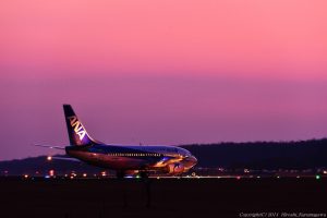滑走路上に夕陽が沈むことで有名な熊本 それは1月と11月のこと 3月ともなればずいぶん北側に沈んでゆく B787を正面から撮影しようと、転回する一瞬を待った 狙ったわけではなかったが、機体に夕陽が写り込んでいた