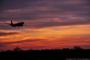 上空はどんよりしていたが、西の空が焼けてきた 日中の空模様で油断してはならない 渦を巻くような見事な雲 背後に見える青い空 痺れた シルエットの地上を入れて着陸機を待ち受けた