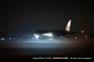 真っ暗な外周道路で最終のB767を待っていた 雨上がりの夜だったので星を絡めて先行機を撮影 いよいよ本番というときに地霧が到来 ランディングライトが目の前の情景を一変させた 2022/9/27