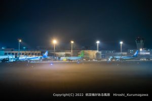 闇の中に整然と並ぶ照明塔 エプロンがステージのように浮かび上がっている 雑音が無いので、暗闇をたっぷりと取り込んだ構図にしている 離陸する機をここに絡めたが、ロゴライトが着いていないのでボツに