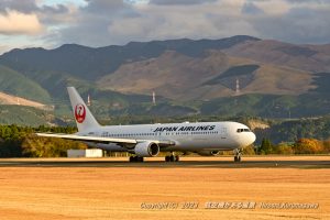 季節を敏感に映す空港 ついこの前には新緑の山を背景に撮っていた しかし冬至を前に枯れ色で冬の装い これは夕方便ではなく午後便と呼んでいるJAL